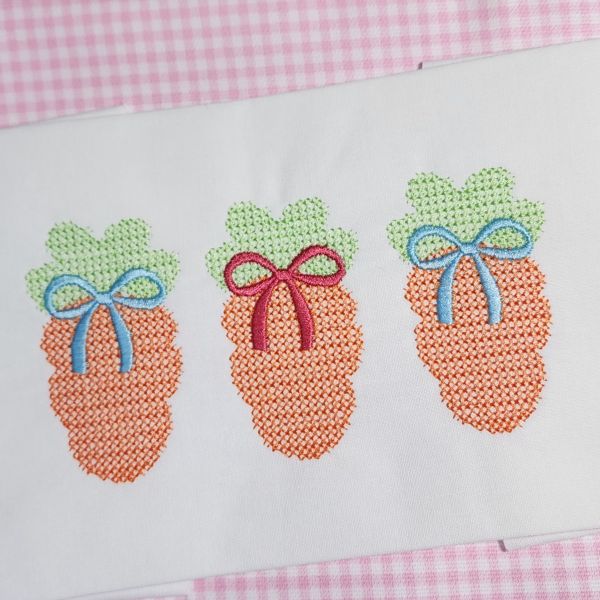 This carrot trio with coquette bows comes in a cross stitch design pattern for machine embroidery, and is perfect for spring and Easter embroidery shirts.